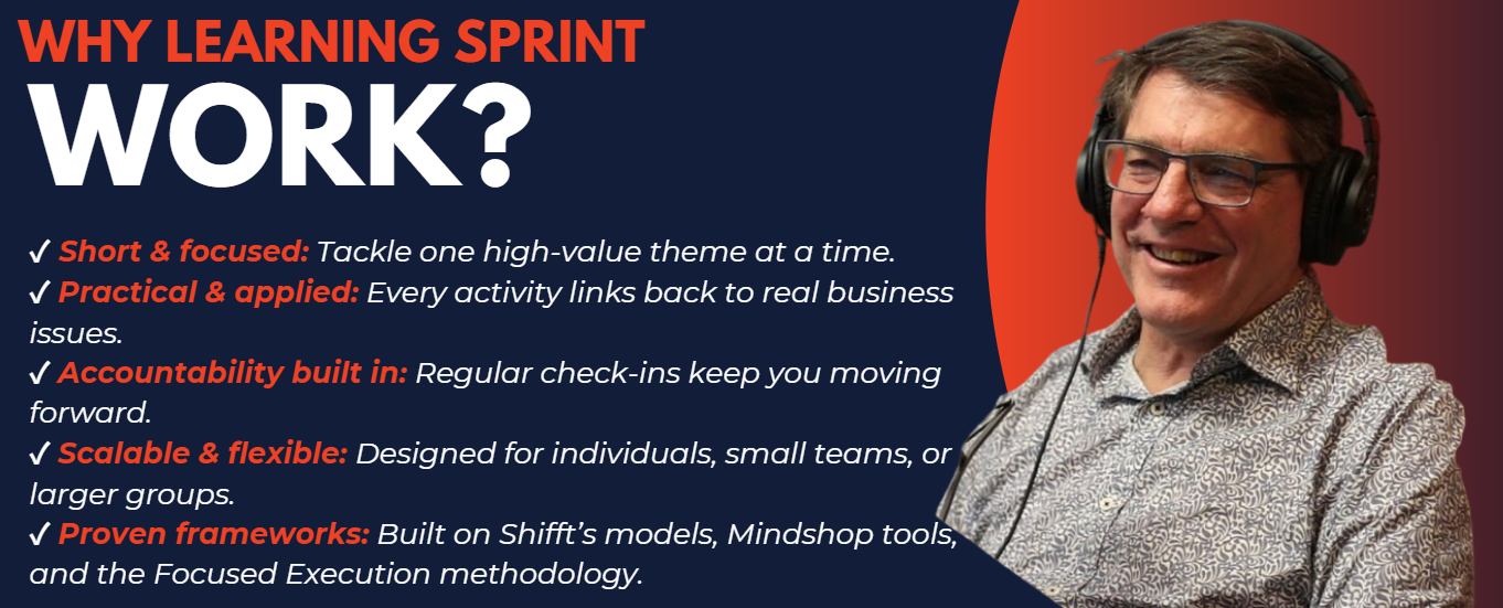 Traditional training often fails because it’s too long, too abstract or too disconnected from real business challenges. That’s why Shifft created Learning Sprints — short, intensive programs that help business owners, executives and teams build capability in key areas and apply it straight away.