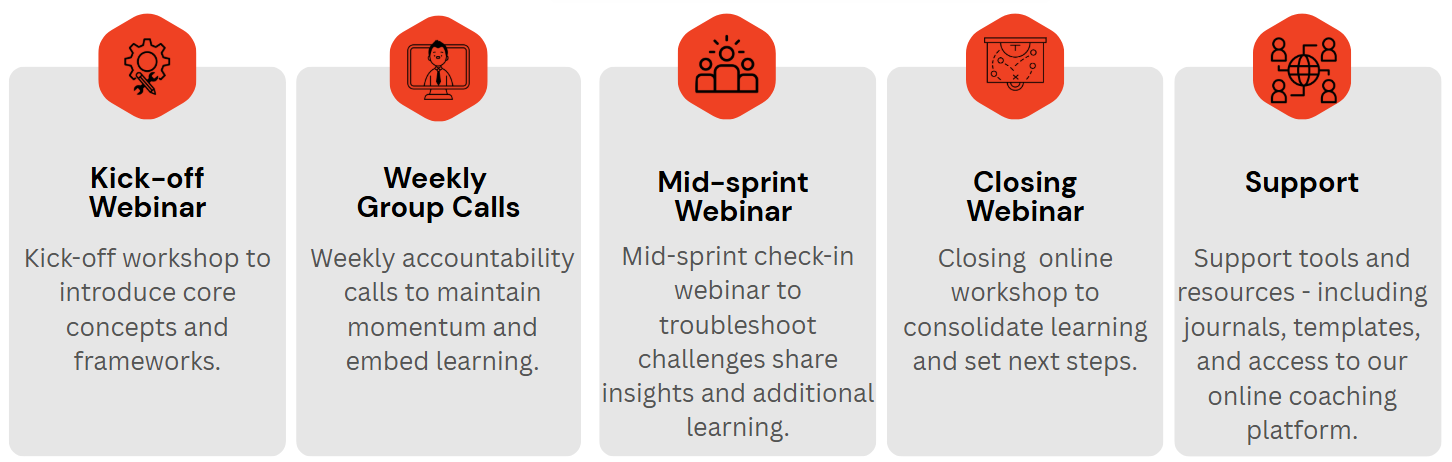 Each Sprint runs over a focused timeframe, blending live workshops, peer learning, accountability and practical tools. They’re designed to fit into your busy schedule while delivering measurable improvements in performance.